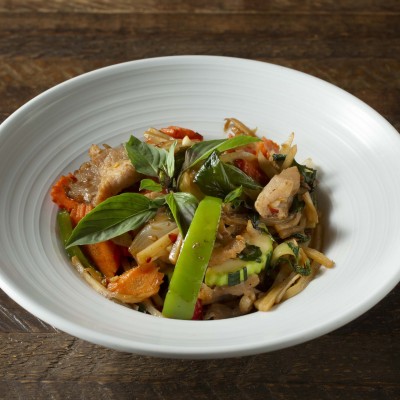 Stir fried flat rice noodles with thai chili, onions, bell peppers, tomatoes, and sweet basil, served over a crisp bed of lettuce.