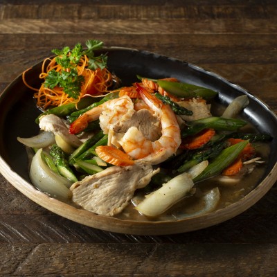 Stir-fried asparagus, carrots, and onions with chicken and shrimp for a flavorful combination.